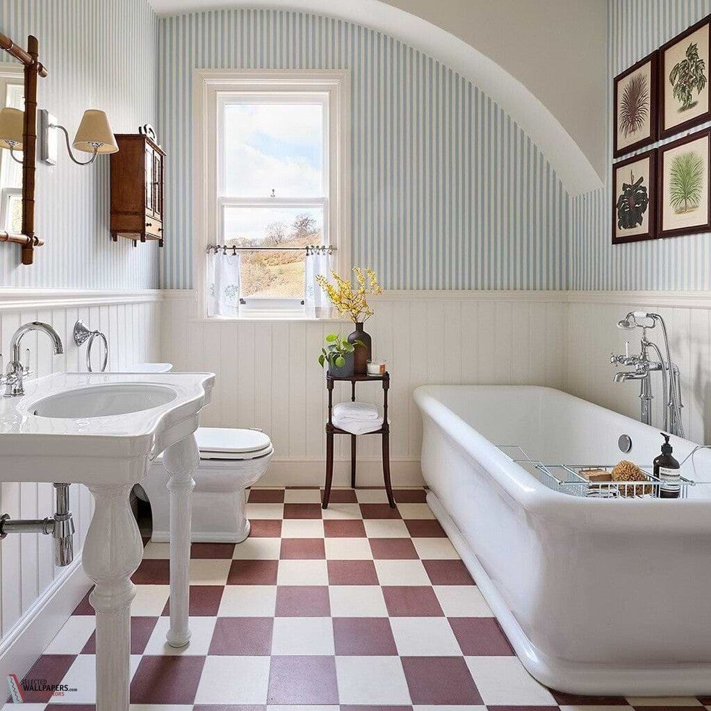 Closet Stripe wallpaper from Farrow & Ball. This wallpaper is only three-quarters of an inch wide and is the thinnest of our stripes, providing a sleek and classic look in both traditional and modern spaces. The traditional dragging technique used to print the pattern gives it an unexpected texture.