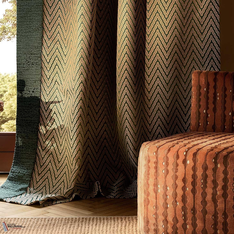 In an interior, the Bari fabric brings movement without restlessness. The wavy pattern with its soft Y-shapes and organic branches fits excellently in contemporary, rustic and transitional interiors. The structure captures daylight in a lively way, allowing the fabric to change character throughout the day. This tactile presence makes it suitable for curtains, cushions or upholstery where you want to introduce a warm, refined texture.