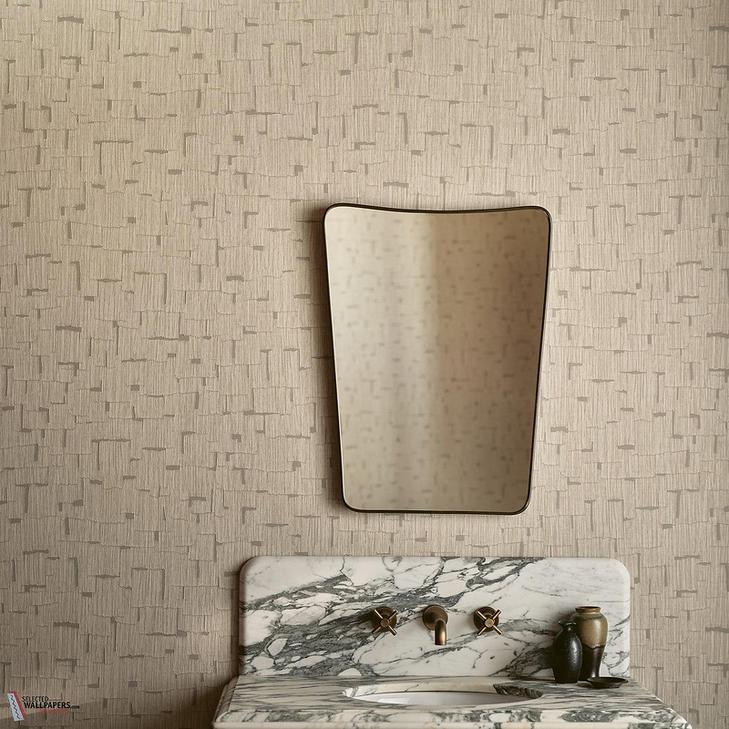 The Kabu wallpaper presents itself with a refined graphic pattern reminiscent of an organic brick structure. Vertical lines intersect horizontal segments, creating a rhythmic play of rectangles and blocks. The execution in soft, natural shades of beige, sand and light taupe creates a calm, harmonious atmosphere. The subtle colour variations between background and motif create an elegant relief effect that makes the pattern stand out just enough without becoming obtrusive.