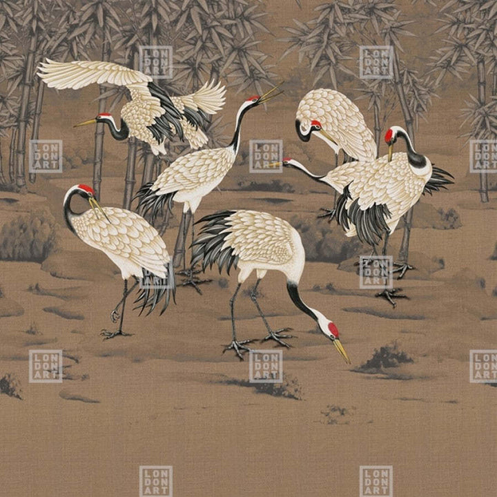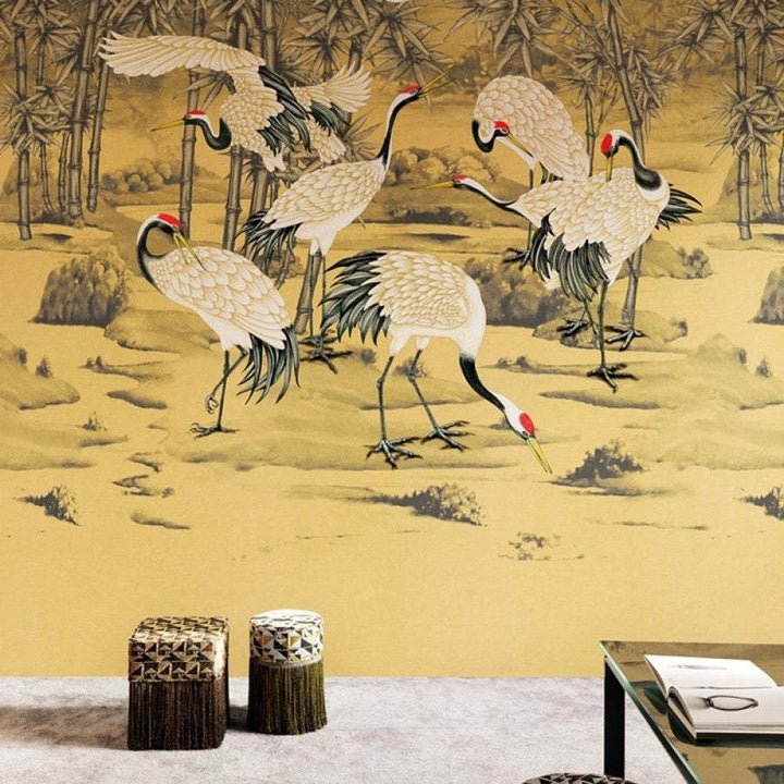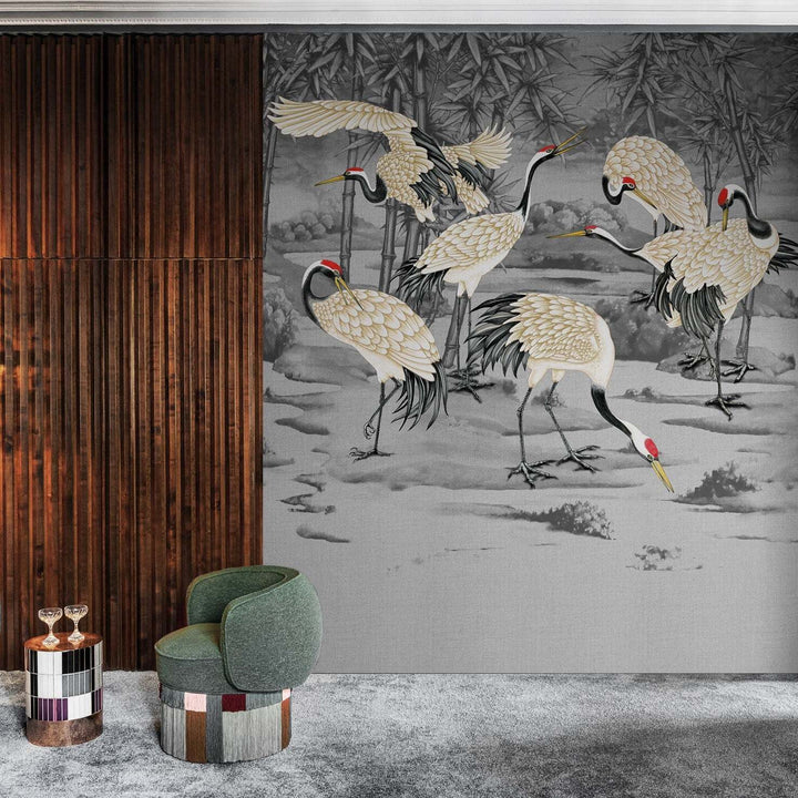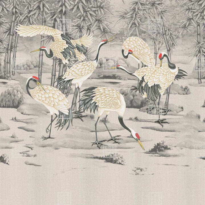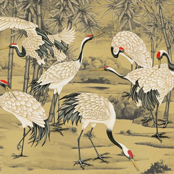 Tabi wallpaper from LondonArt. This wallpaper features an oriental chinoiserie, where cranes find their way among the bamboo. An oriental scene. Wallpaper Tabi LondonArt Wallpaper Tale Books Kimono Collection.
