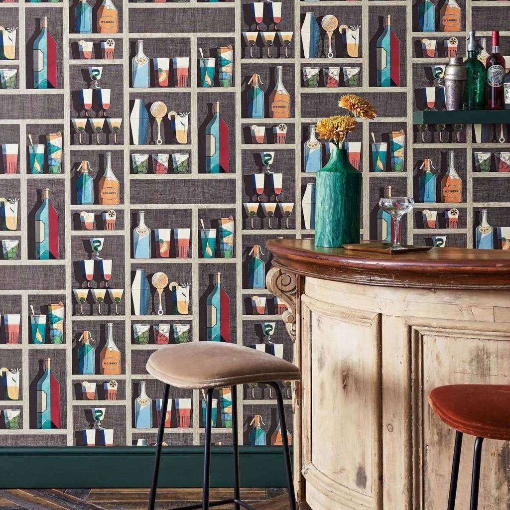 Cocktails wallpaper by Cole and Son. This wallpaper is derived from an ice bucket design created by Fornasetti in the 1950s. The stylized graphic bottles and glassware are incorporated into a lively design called Cocktails.