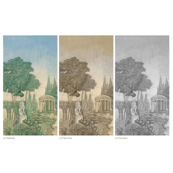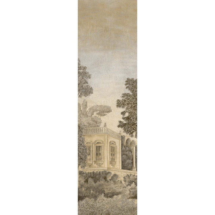 Bagatelle wallpaper from Iksel. This Scenic is inspired by a block print called Jardins de Bagatelle, published in 1805. Manufacturer Anon. We have adapted this design in gouache on a crackled background. The original characters have all been removed. Green and architecture, sculptures and follies take over our version of this idyllic garden.