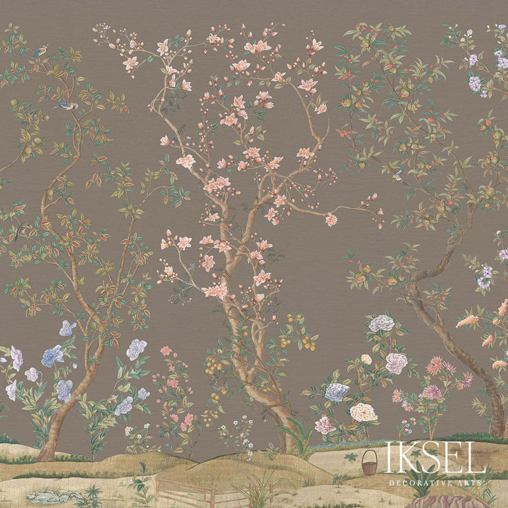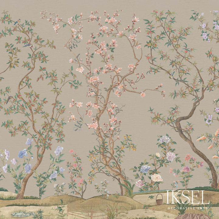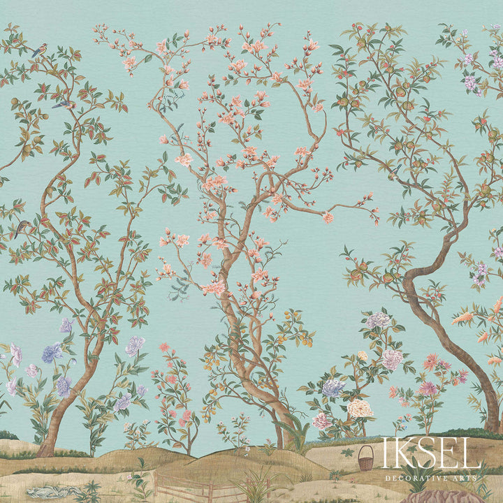 Imperial Garden wallpaper Iksel. This wallpaper decor was originally a traditional Chinese wallpaper from the East India Company. It was repainted in Iksel's studio from stencils that were lent by an antique dealer who had the original panels. The atmosphere is unmistakably European and early 19th century. An oriental chinoiserie.