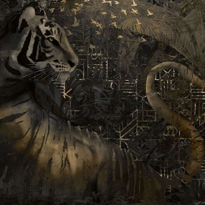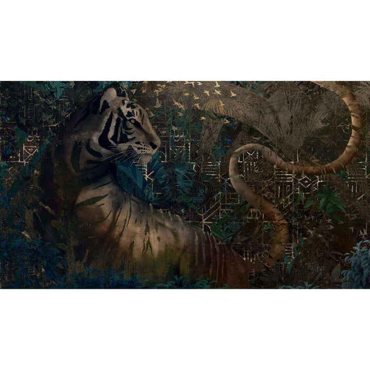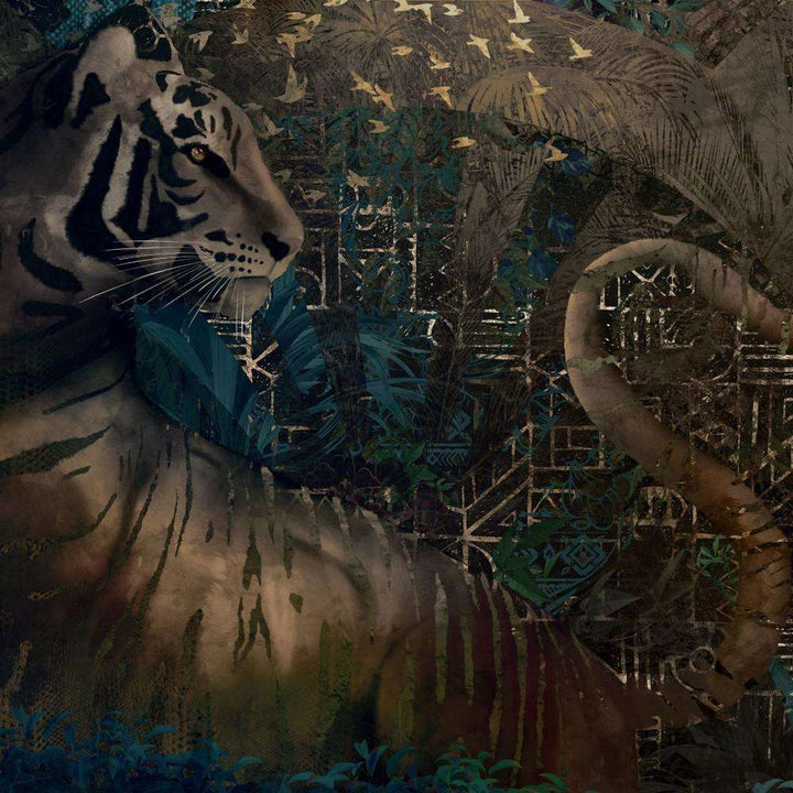 Hunting Party wallpaper by Muance. This custom wallpaper is tropical and features a large tiger as the main attraction. Available in a series of three colors, an absolute mood enhancer in any space!