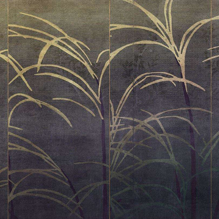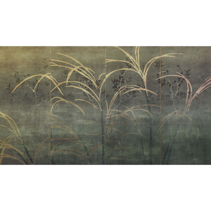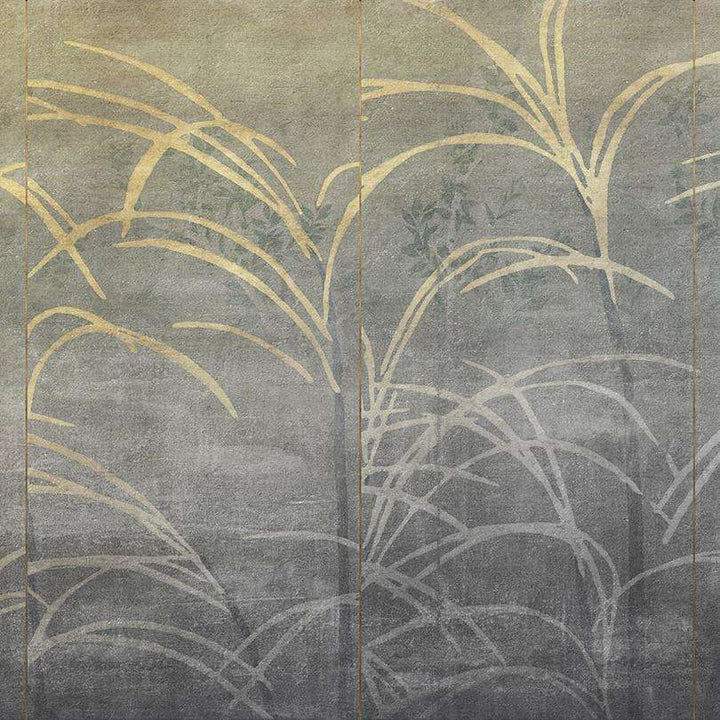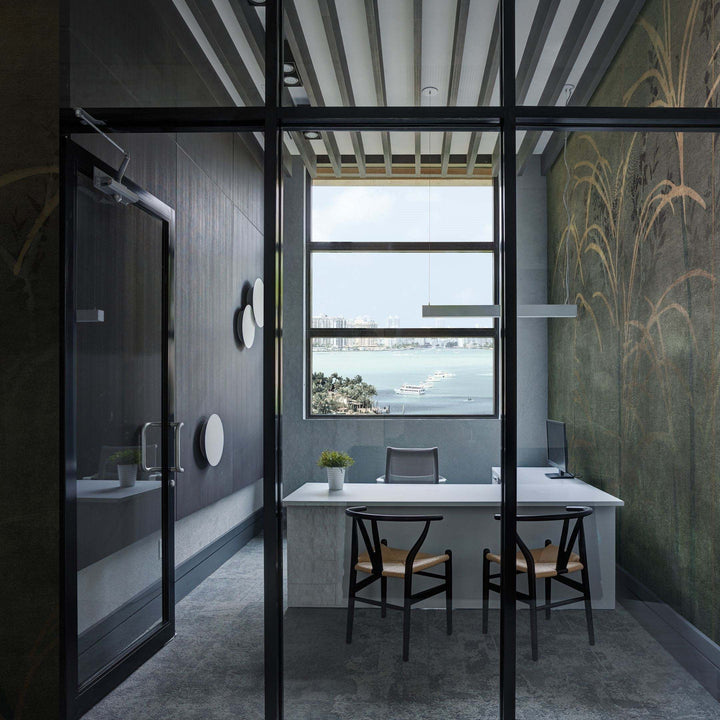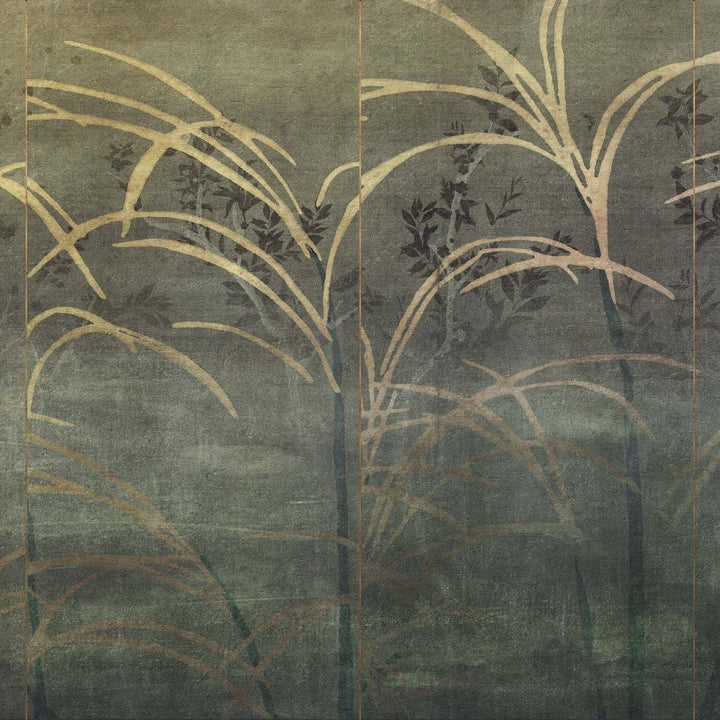 Maravilla wallpaper custom-made by Muance. This wallpaper is a beautiful design in which leaves and graceful stripes create a calming and natural wallpaper.