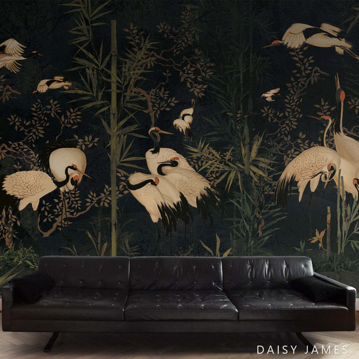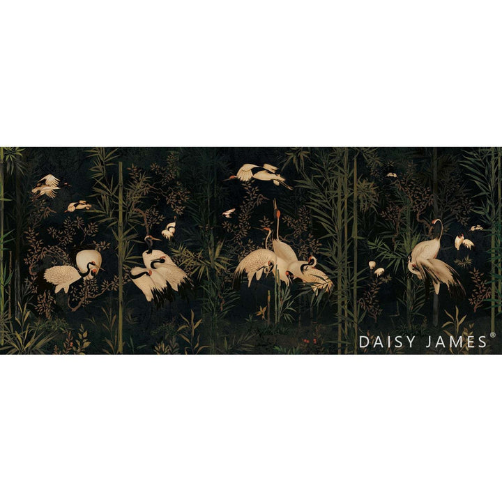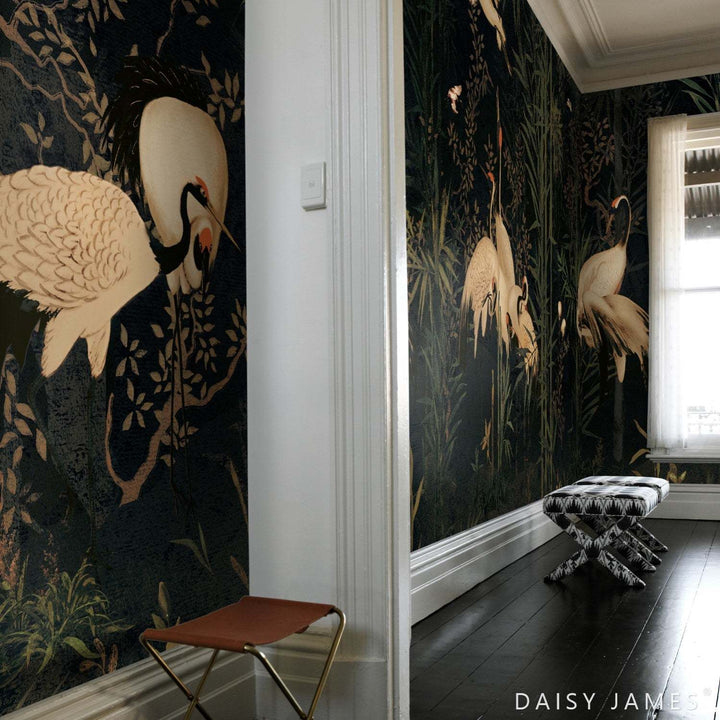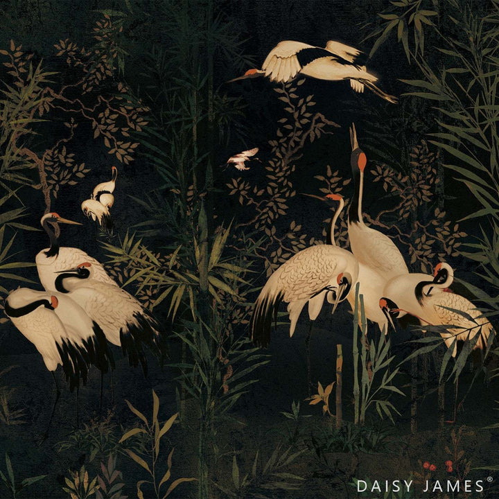 The Red Crown wallpaper Daisy James. This custom wallpaper is an oriental scene featuring beautiful white cranes in the leading role. A wonderful mood enhancer in any interior. Wallpaper The Red Crown DJ313 Daisy James.