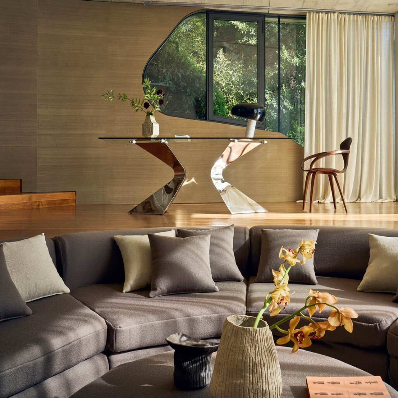 The fibers are imbued with a refined Japanese energy, reminiscent of precious tatami mats in natural tobacco hues. The subdued colors and quiet character of the materials create a serene, harmonious atmosphere that fits perfectly in modern, minimalist, and luxurious interiors. Think living rooms, bedrooms, hotels, and high-end projects where natural materials take center stage.