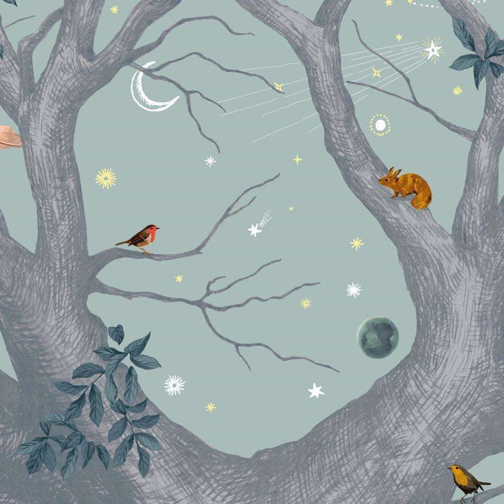 Arbacadabra wallpaper by Isidore Leroy. This wallpaper is a night ritual in a forest where the animals come to life. Full of stars and planets, this is an amazing wallpaper for a children's room. Wallpaper Arbacadabra Isidore Leroy