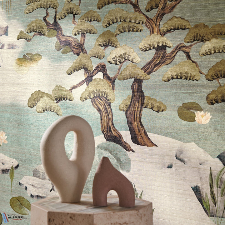 Adachi wallpaper Casamance. This wallpaper shows a landscape of a Japanese garden. Ponds, vegetation in a beautiful oriental panorama on a surface that suggests silk. Wallpaper Adachi Casamance Exploration 24 01 collection.