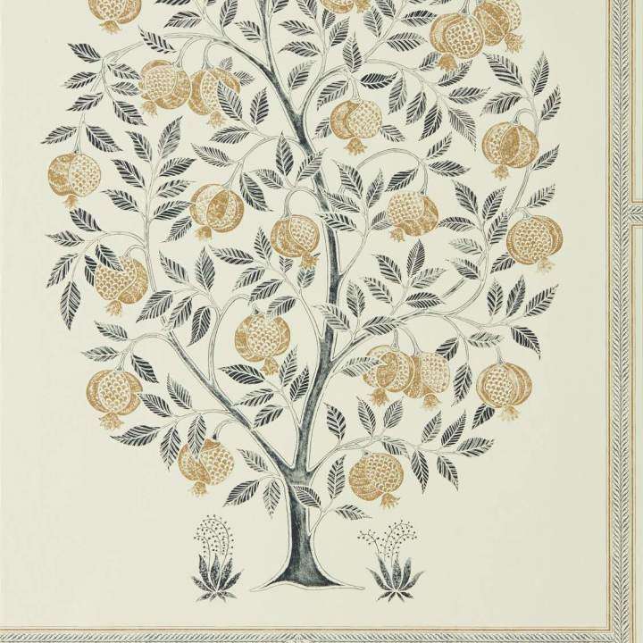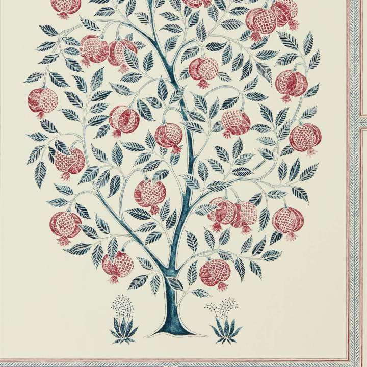 Anaar Tree wallpaper from Sanderson. This wallpaper features a beautifully proportioned pomegranate tree. The wallpaper is hand-drawn and finished with a fine decorative border. A repeating half-drop creates a striking picture frame effect and a hand-printed look adds texture details to this wide-width wallpaper design.