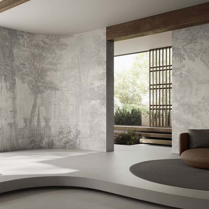 Athens wallpaper by Glamora. This custom wallpaper mixes nature and architecture in a muted atmosphere. A beautiful landscape. Wallpaper Athens Glamora Creative Collection Chapter XIII.