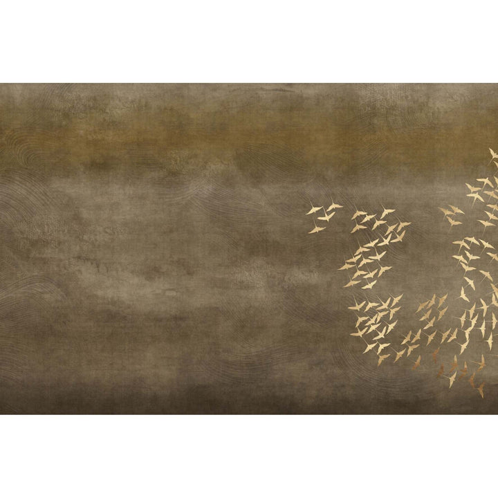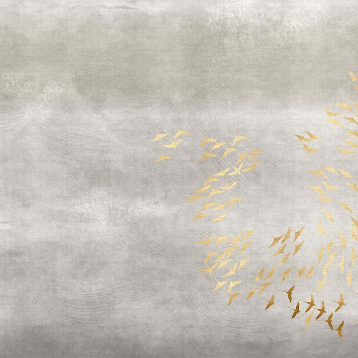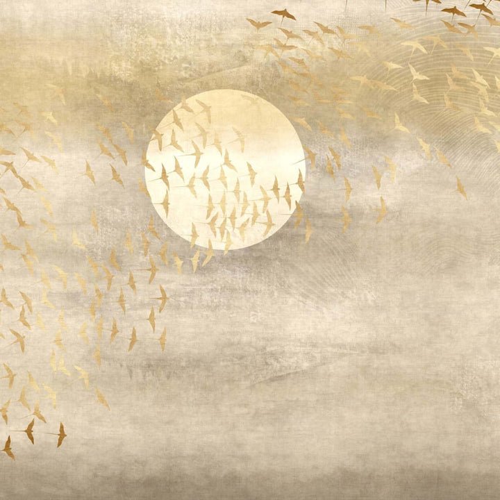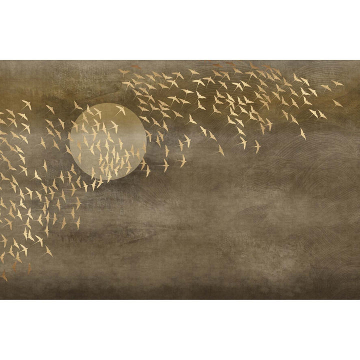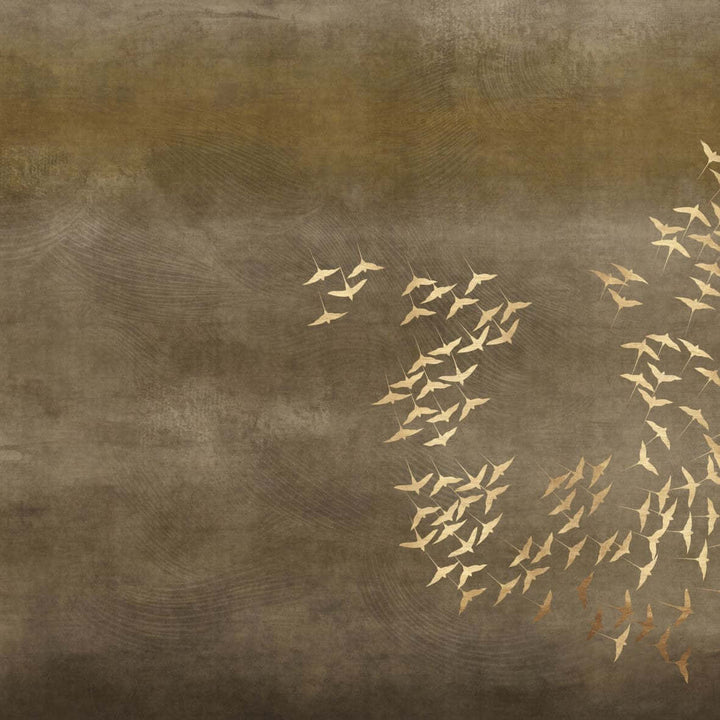 Aurea wallpaper by Glamora. This wallpaper provides a beautiful depth and warm atmosphere. A flock of birds finds its way across the vast horizon. Available with and without sun in several natural shades.