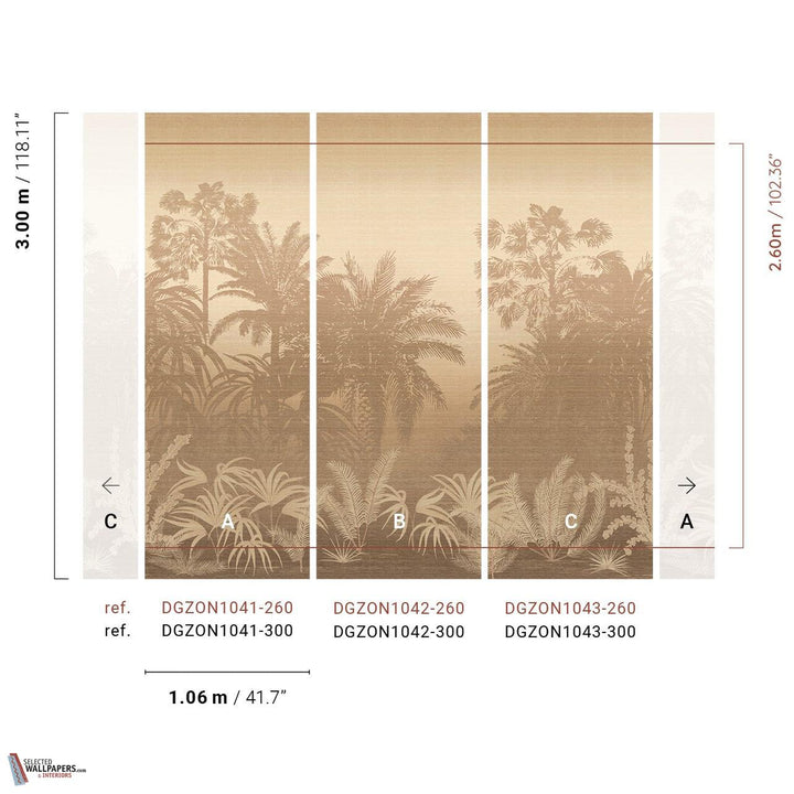 The Awarra wallpaper is available per panel of 260 or 300 cm high, making it ideal for spaces with high walls or for creating impressive statement walls. The panels can be seamlessly combined to create a larger, seamless panorama. This makes the wallpaper perfect for both large and smaller spaces, depending on the desired effect and dimensions. Choose whether you start with panel A, B, or C, the panels can be endlessly combined.