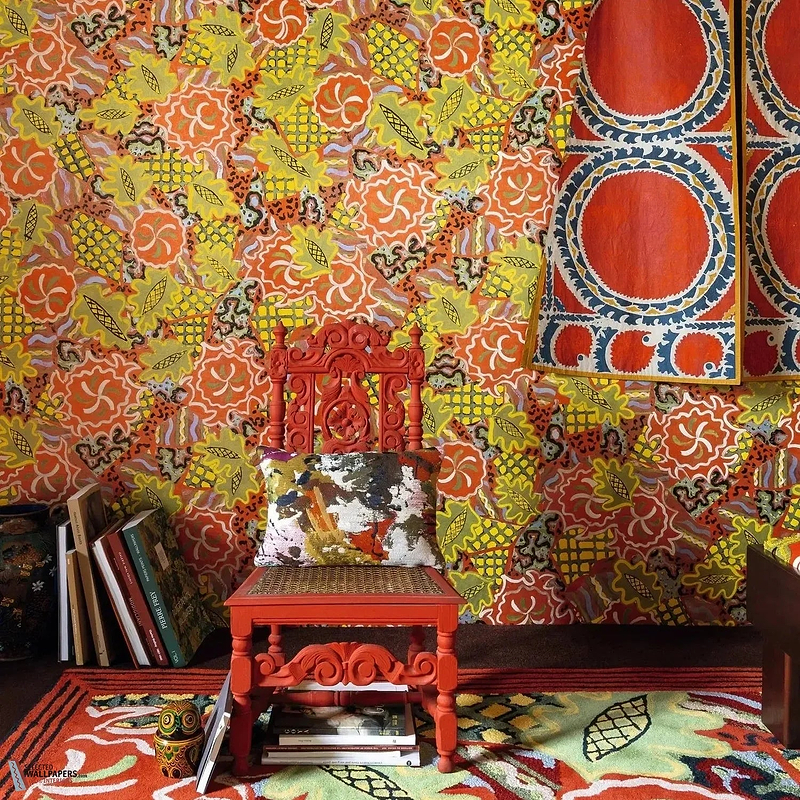 In an interior, the Bebelle wallpaper creates a striking, energetic presence that perfectly suits eclectic, bohemian or contemporary-artistic styles. The overlapping patterns give the wall a rich, almost tactile character without being literally textured. The graphic diversity provides movement and playfulness, ideal for a feature wall in a living room, hallway or creative workspace. The pattern brings warmth and personality to modern or classically furnished spaces with a preference for colour.