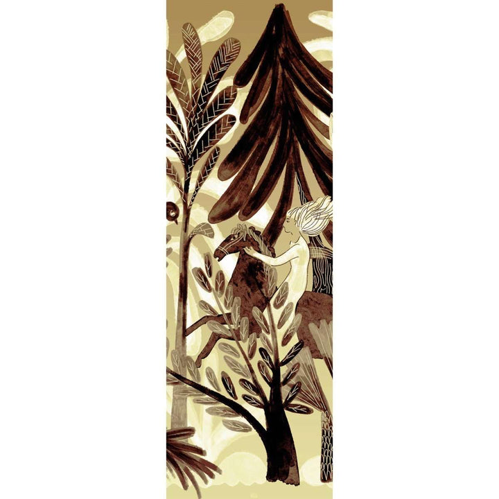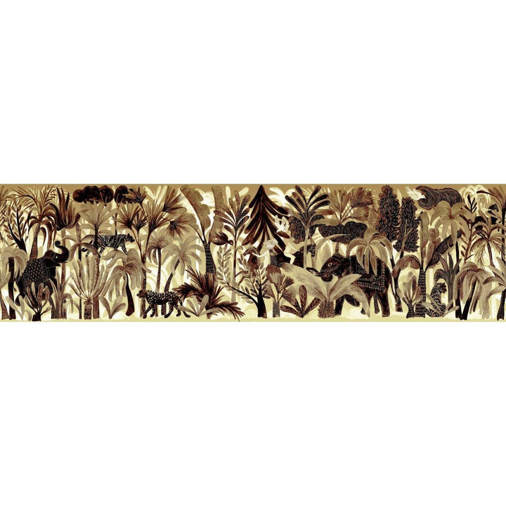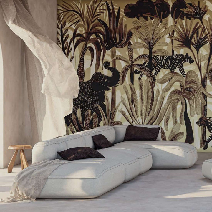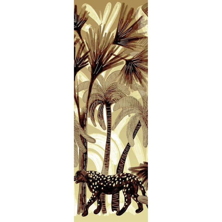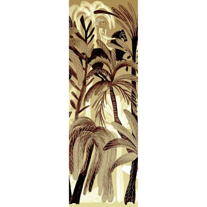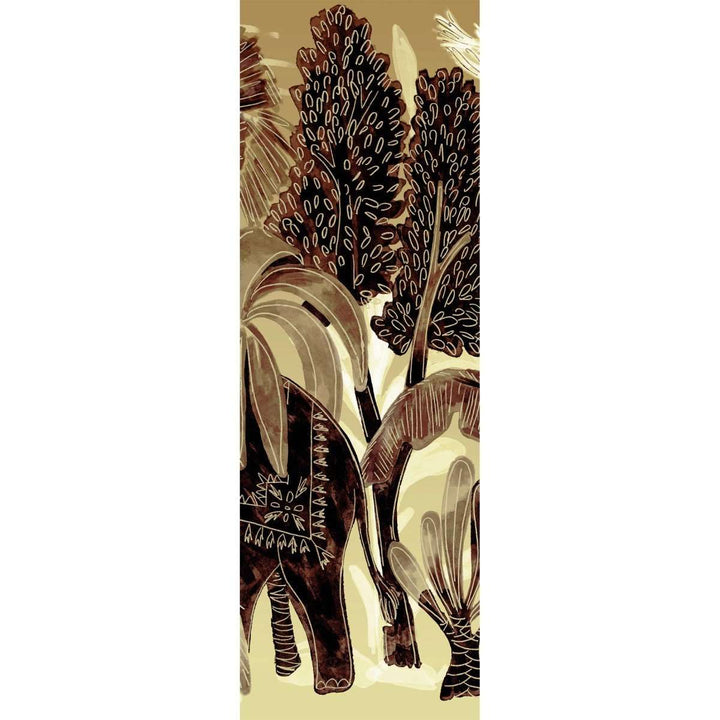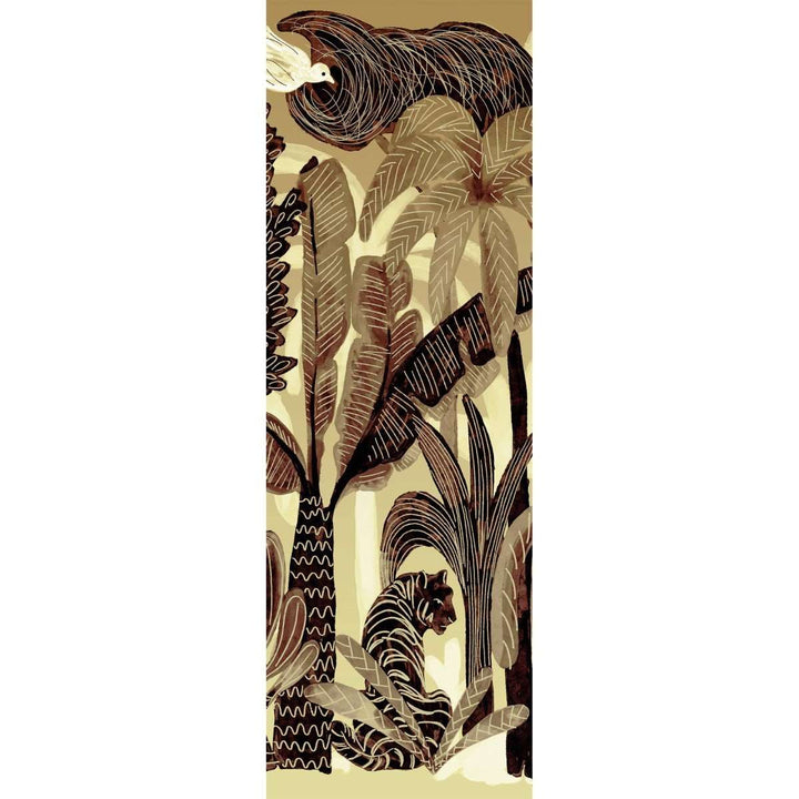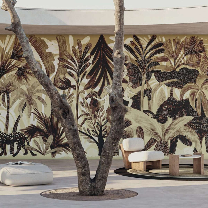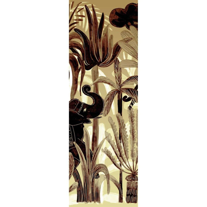 Panoramic Bel Ami by Elitis. This panoramic wallpaper from the 360 collection is a tropical landscape with elephants and panthers. In beautiful natural tones, a warm eye-catcher on any wall. Available as a complete landscape, or create your own landscape with separate panels.