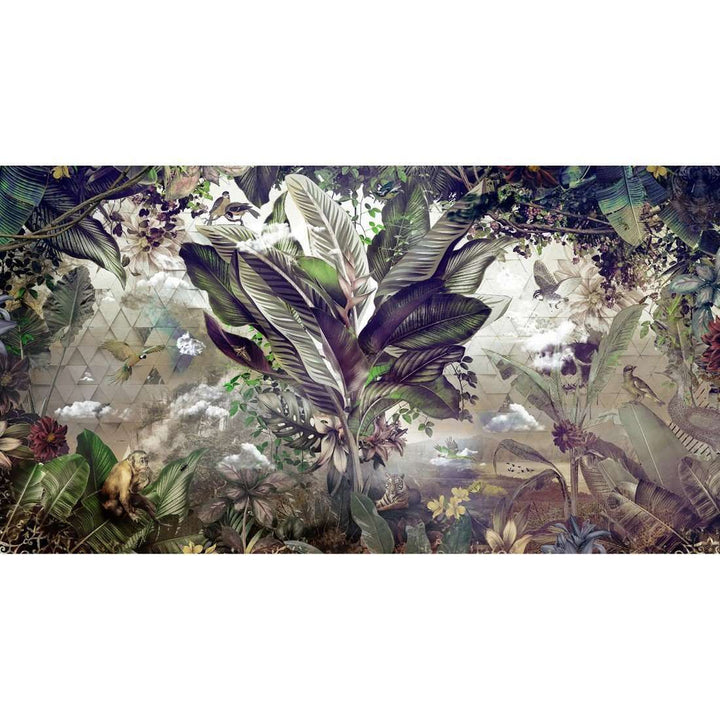Bongo Congo wallpaper custom-made by Muance. This wallpaper is a stunning tropical panorama. A green jungle full of depth, large palm leaves, and animals like monkeys and parrots.