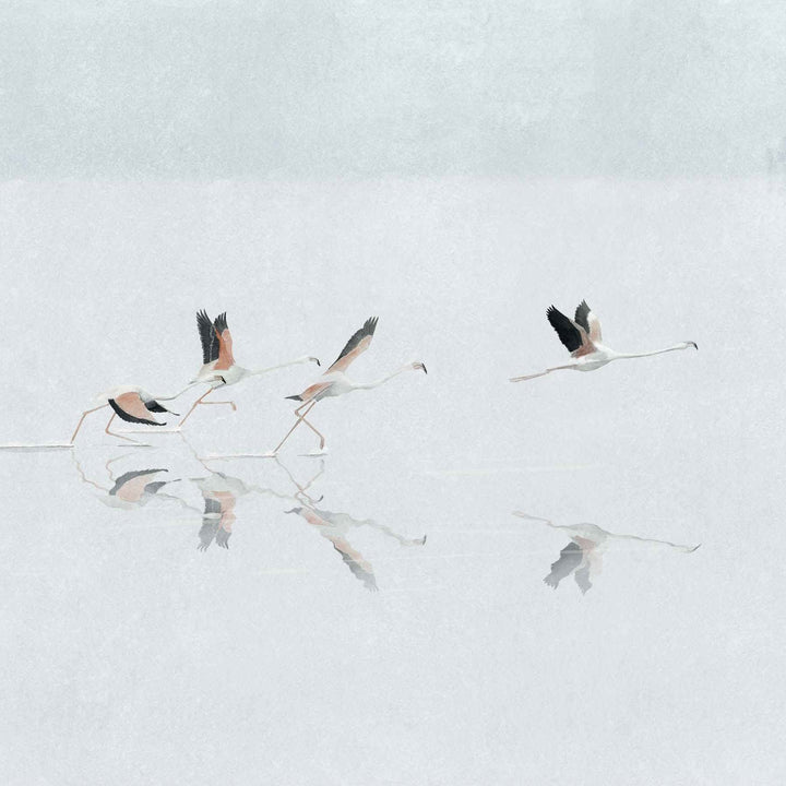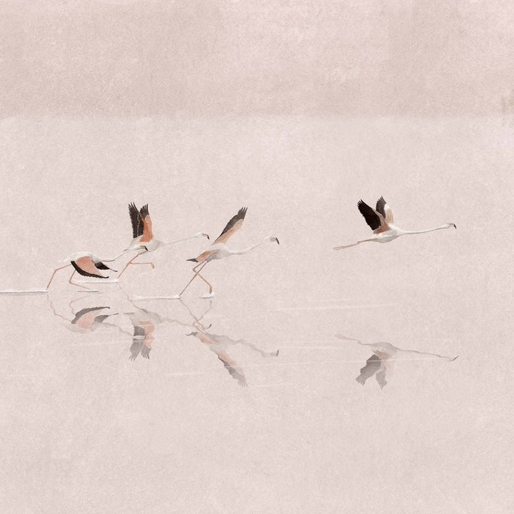 Donana Textile wallpaper Coordonne. This wallpaper shows a family of flamingos at sunrise. An epic image of a journey through a nature reserve. Custom textile wallpaper that is printed on linen or silk material. Wallpaper Donana Textile Coordonne Aracne collection.