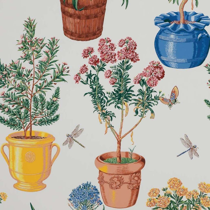 Florilege wallpaper from Boussac. This wallpaper is full of blooming shrubs in ceramic pots that you find in Italian gardens. Wallpaper hand-printed in a frame. Not trimmed.