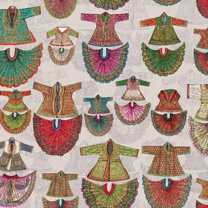 Gaya wallpaper by Pierre Frey. A beautiful wallpaper full of culture. Costumes of beautiful kimonos dance across the wall in this wallpaper with Eastern inspiration. Adds color and culture to the space. Wallpaper Gaya Pierre Frey Les Dessins collection.