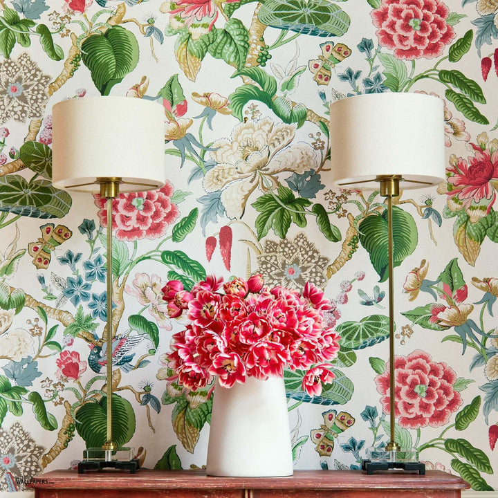Hill Garden wallpaper by Thibaut. This wallpaper features large floral clusters and leaves. A densely grown vegetation where birds find their way.. Wallpaper Hill Garden Thibaut from the Grand Palace collection.