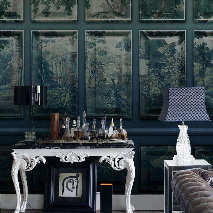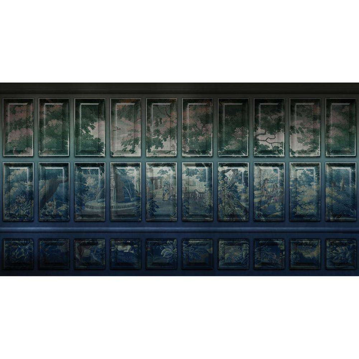 Isle of Sky wallpaper custom-made by Muance. This wallpaper creates a wainscoting with panels above it. The panels feature a large continuous panorama, creating a fantastic depth effect.