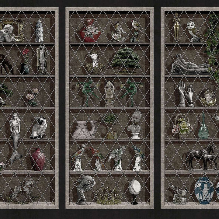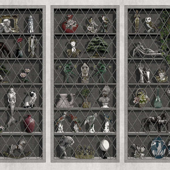Object Story wallpaper by LondonArt wallpaper. This wallpaper depicts a showcase of objects full of memories and souvenirs. Images of mermaids, parrots, bonsai, and vases and ceramics. A magical wallpaper.