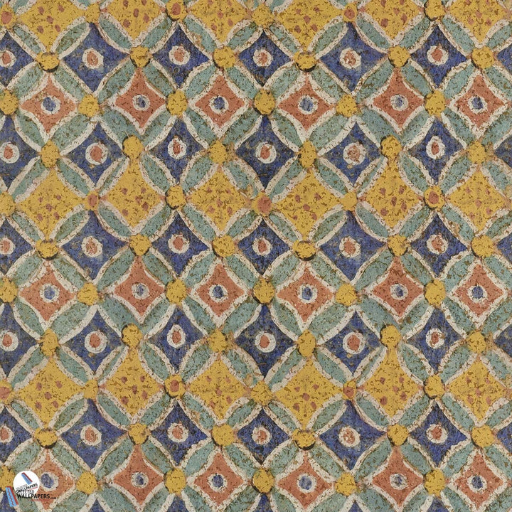 Ouaset wallpaper by Pierre Frey. This wallpaper is printed on cork and features a colorful graphic design. Based on fabulous drawings of the temples from ancient Egypt. Wallpaper Ouaset from the Merveilles D'Egypte collection by Pierre Frey.