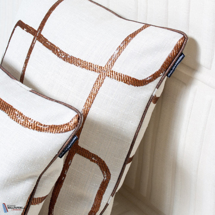 Promenade Kafkaienne cushion Dedar. A cushion made with the Promenade Kafkaienne fabric. One shows a graphic pattern of shiny raffia ribbons. The back of the cushion is made of the same fabric and has a concealed zipper. Cushion Promenade Kafkaienne Dedar Selected Cushions collection.