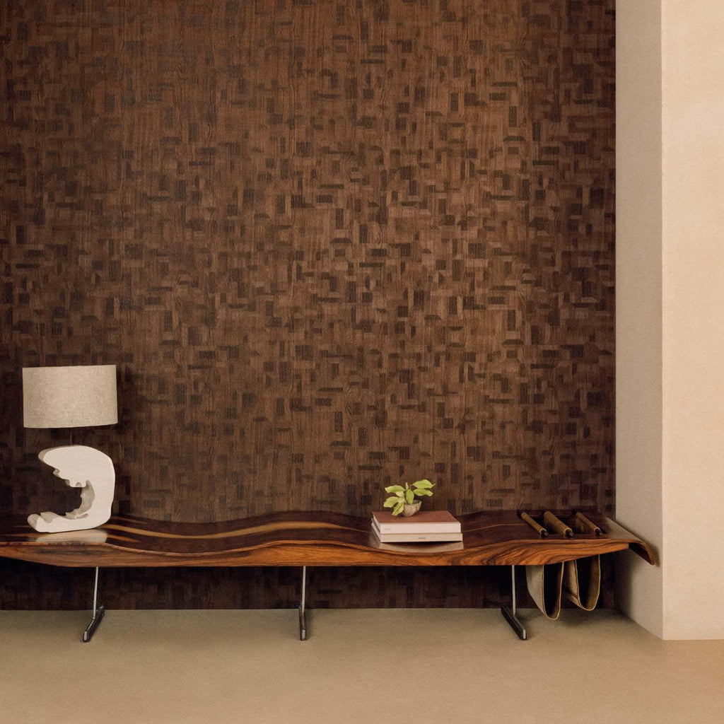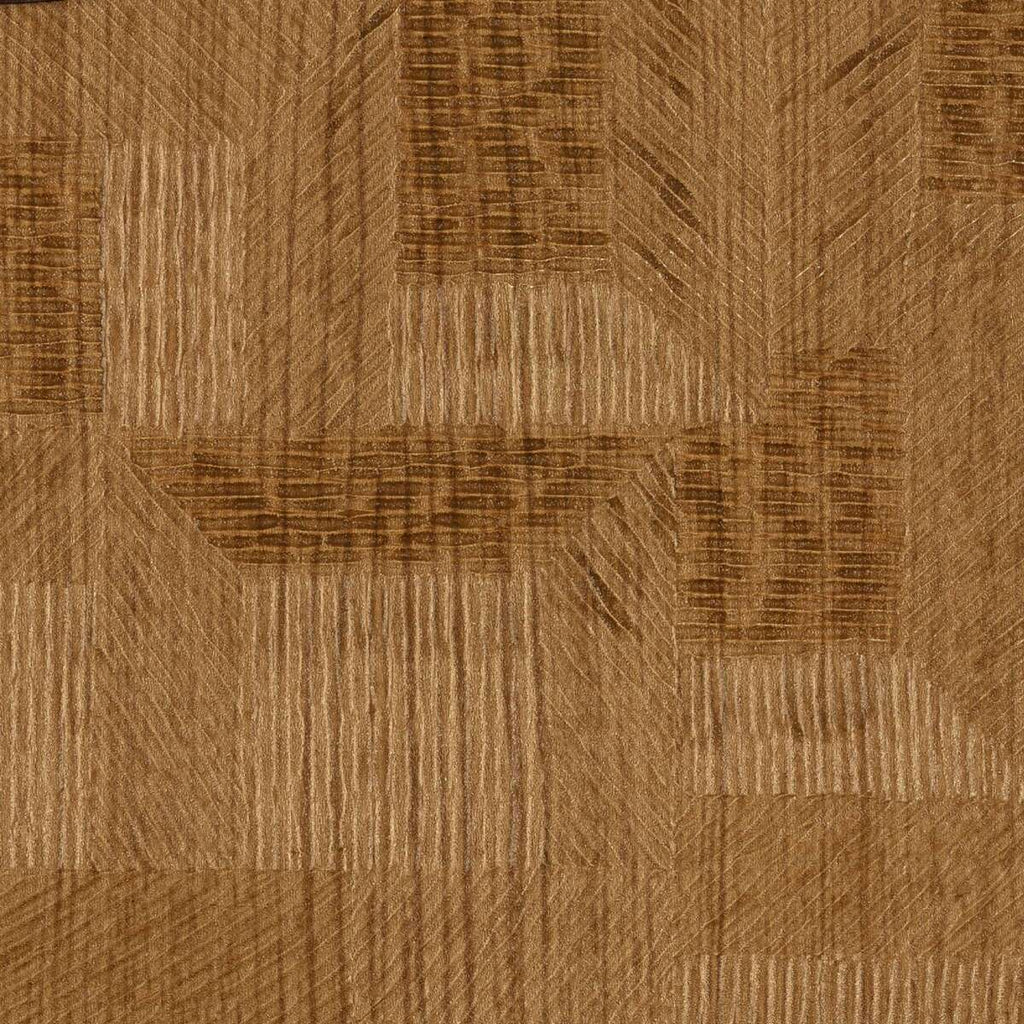 Ramille wallpaper from Elitis. This wallpaper has the look and feel of wood, full of texture with geometric shapes that give an optical depth. It creates a warm and natural atmosphere in the space. Vinyl wallpaper Ramille from Elitis from the Bois Sculpte collection.