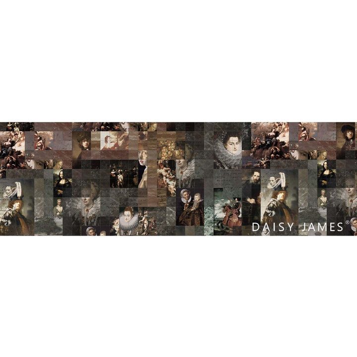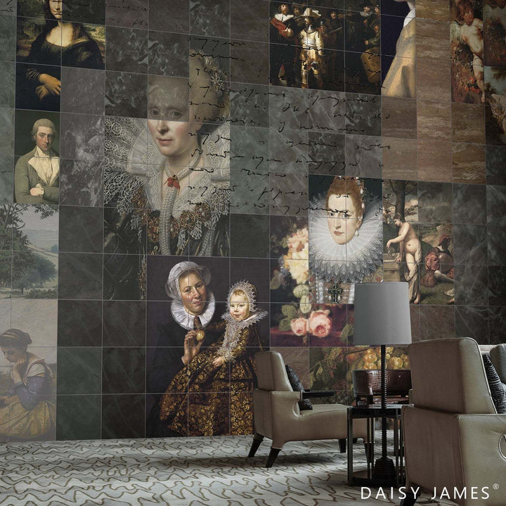 The Marble exclusive wallpaper by Daisy James. This wallpaper is full of images and is like a work of art full of paintings on the wall. Including the Girl with a Pearl Earring, Mona Lisa, Rembrandt. It adds an authentic atmosphere to the space. This wallpaper is custom made.