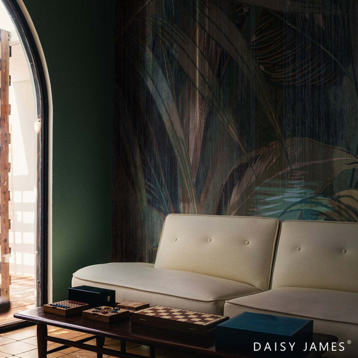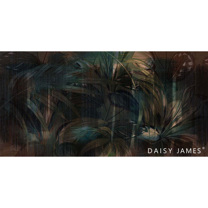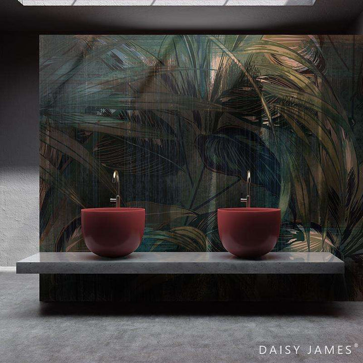The Wash wallpaper by Daisy James. This wallpaper has a natural appearance due to its large tropical leaves that blend into each other and are cloaked in deep colors.