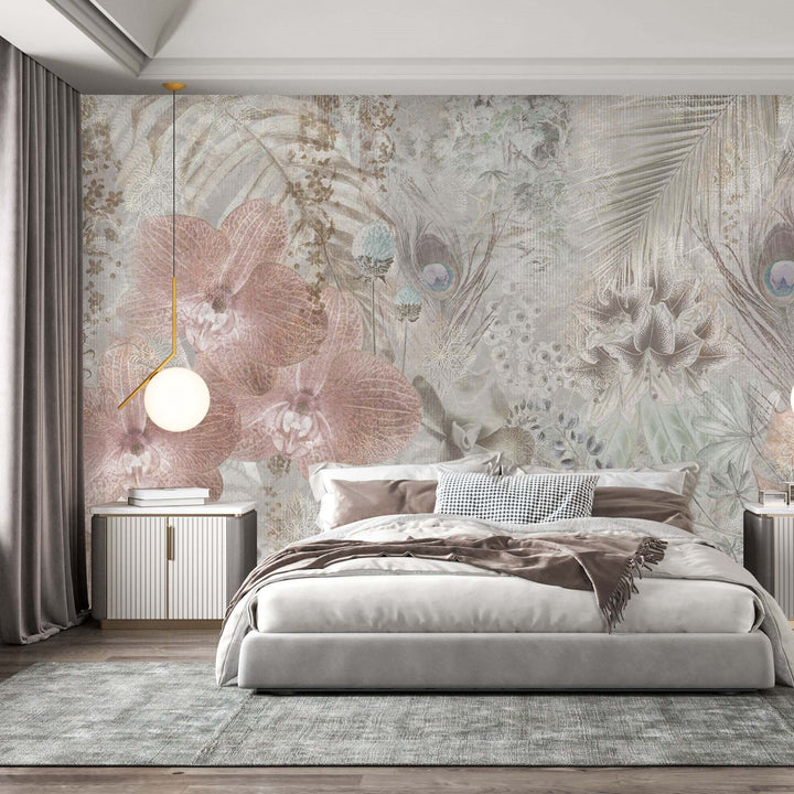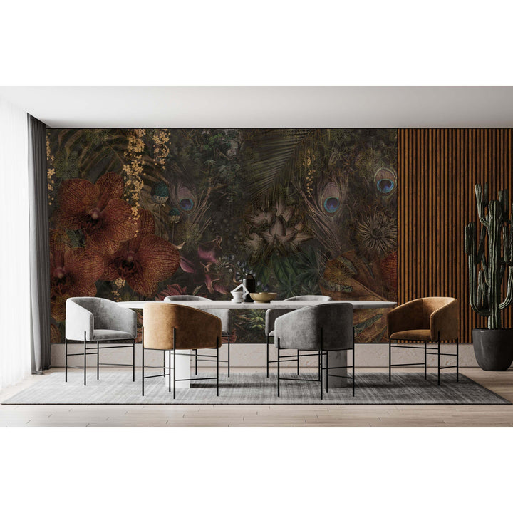 Till the Unknown wallpaper Presence. This custom wallpaper lets you wander into the unknown. A natural atmosphere where flowers, tropical leaves, and peacock feathers merge into a striking eyecatcher! A panorama in 6 atmospheric color schemes. Wallpaper Till the Unknown Presence.