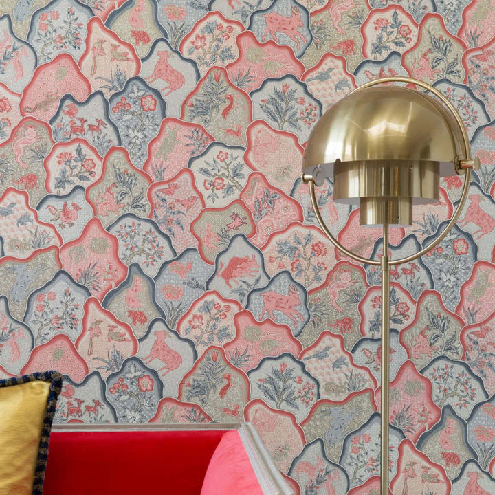 Toile des Indes wallpaper Braquenie. This wallpaper represents scenes of animals integrated into knolls and inspired by an iconic Braquenié painting. Soft non-woven print. Wallpaper Toile des Indes Braquenie Compagnie des Indes collection.