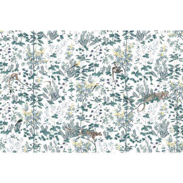 Wild Story wallpaper by Les Dominotiers. The wallpaper features jungle animals in lush vegetation. Tiger, monkeys, and birds live in this colorful jungle. An excellent wallpaper for a children's room.