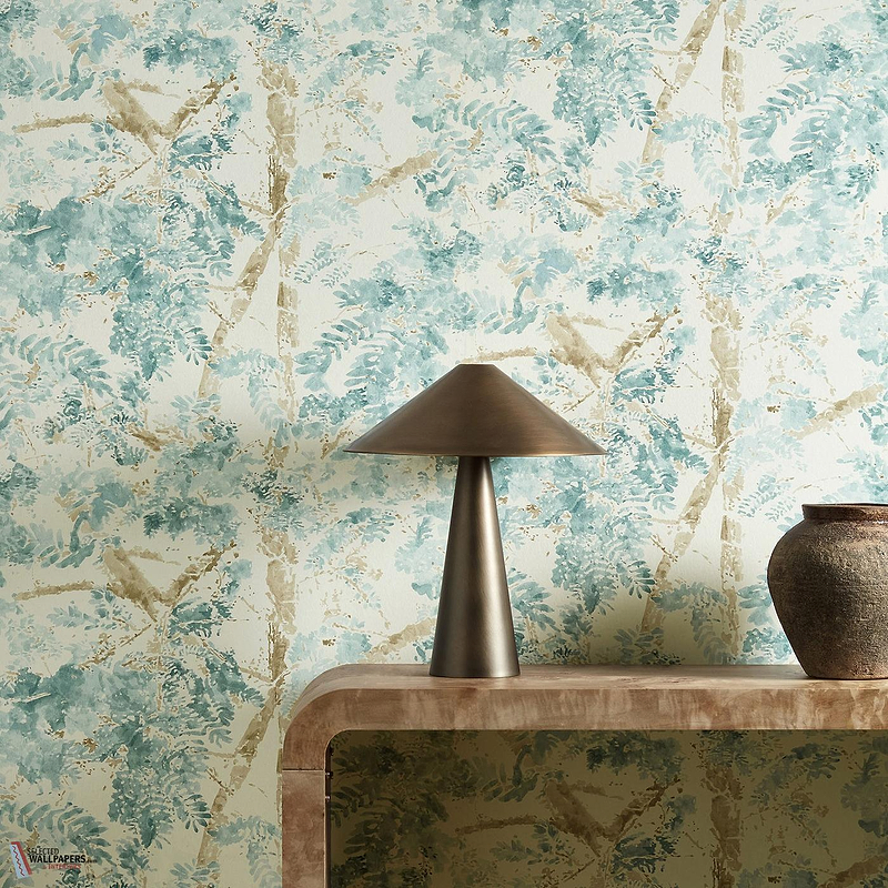Ceiba wallpaper is part of the refined Zamora collection by Harlequin. The soft turquoise and beige tones harmonise effortlessly with natural materials and light interiors. This colour scheme brings calm and freshness, ideal for bedrooms, living spaces or offices where serenity is paramount.