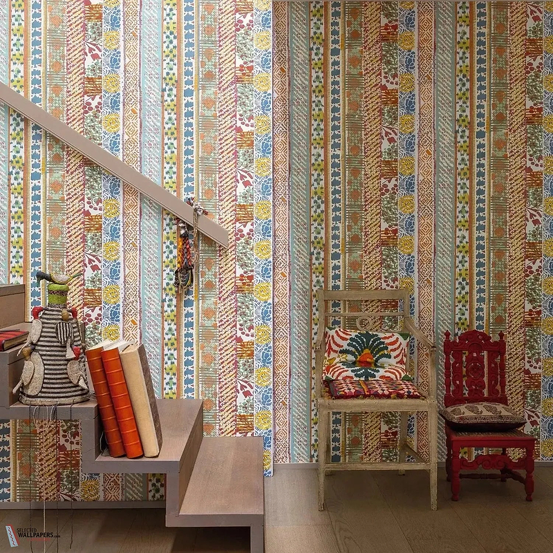 The colourful vertical panels of the Frida wallpaper combine warm tones such as terracotta, ochre yellow and pink with cooler nuances of stone blue, mint green and cream. This varied colour scheme ensures an exuberant yet balanced appearance. The design is part of the Memoires Colorees collection, in which colour and artisanal patterns are central.