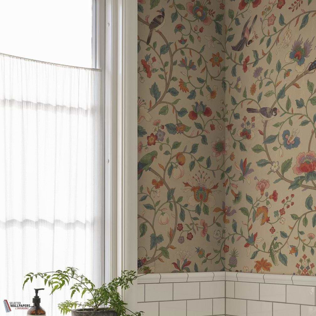 In an interior, Hedda wallpaper brings a sense of serenity and visual richness. It fits excellently in both classic and modern country interiors, where the botanical motifs create a warm, refined atmosphere without being obtrusive. The birds, carefully placed among the foliage, give the design a lively dimension. This wall covering forms a harmonious background that combines tranquility and character, giving your space an artistic and thoughtful appearance.