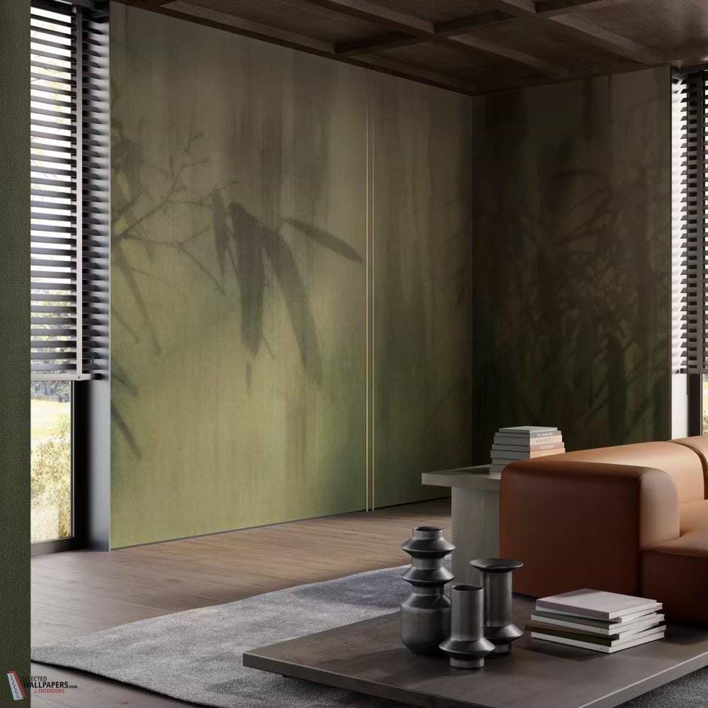 The Viridia wallpaper designs are inspired by Asian gardens and misty landscapes, where natural elements are rendered as fleeting shadows. The leaves appear to float in the air, creating a soft layering that adds depth to the wall without being overpowering. Perfect for a living room, bedroom, or meditation room.