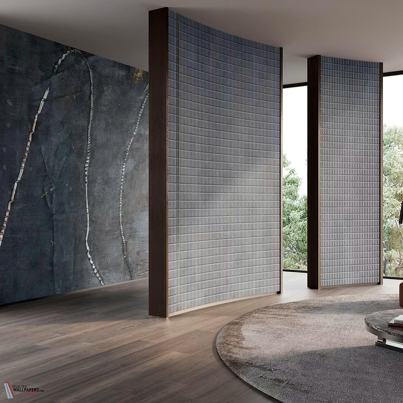 De kleurwereld van het Zierlinie behang beweegt zich in donkergrijze en grafietachtige tinten, met subtiele accenten van warmgoud en koelblauw. Dit ontwerp maakt deel uit van de Creative Collection - Chapter XV, een collectie die zich kenmerkt door geraffineerde abstractie en ambachtelijke texturen.