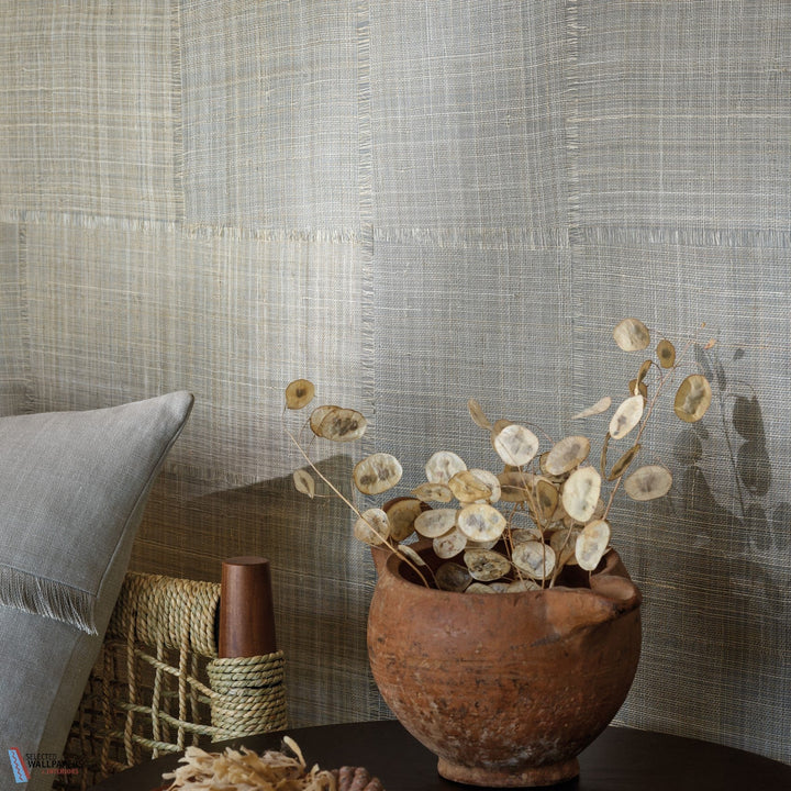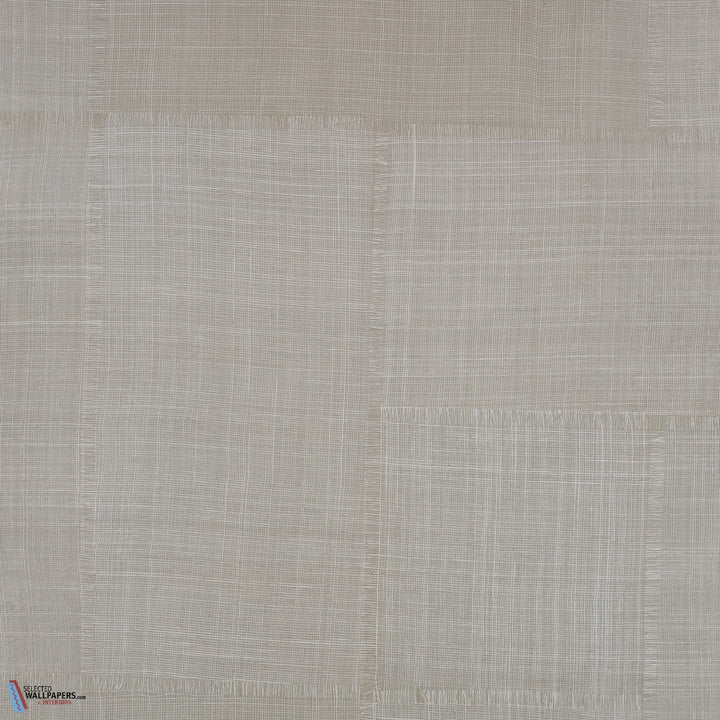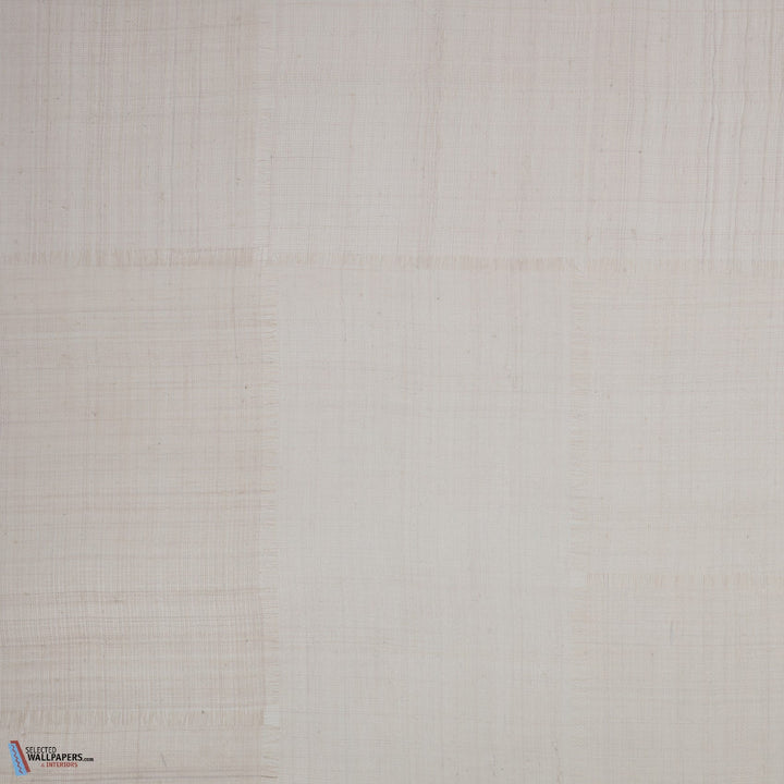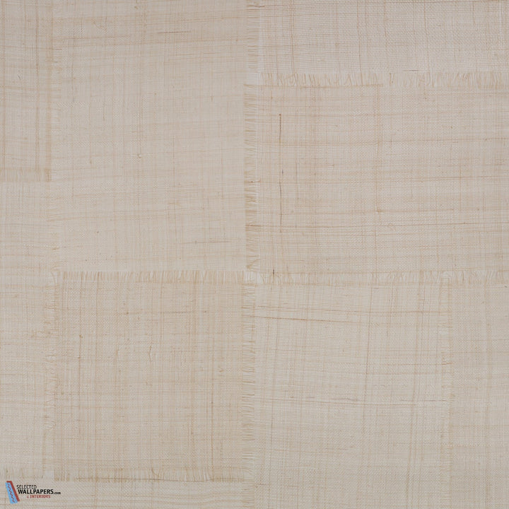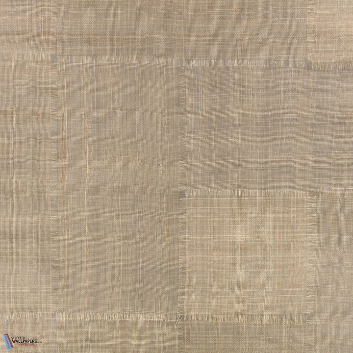 Abaca Patchwork behang Mark Alexander. Dit natuurlijke behang toont verschillende vormen van geweven abaca dat overlappend op gekleurd papier wordt aangebracht. Behang Abaca Patchwork Mark Alexander Collage III collectie.