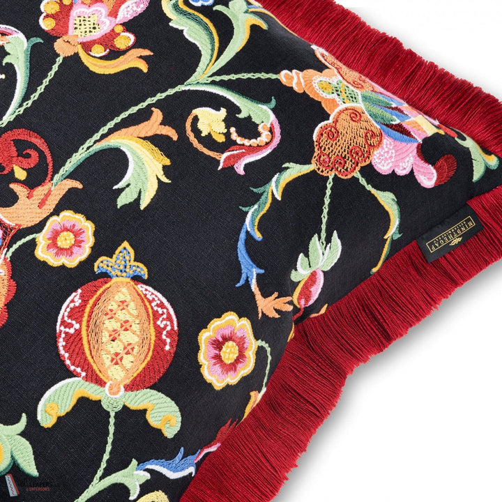 Al Fresco Embroidered kussen Mind the Gap. Een kussen met levendige bloemen op een opvallende zwarte achtergrond. Elk bloemblaadje straalt vreugde uit. Kussen Al Fresco Embroidered Mind the Gap.