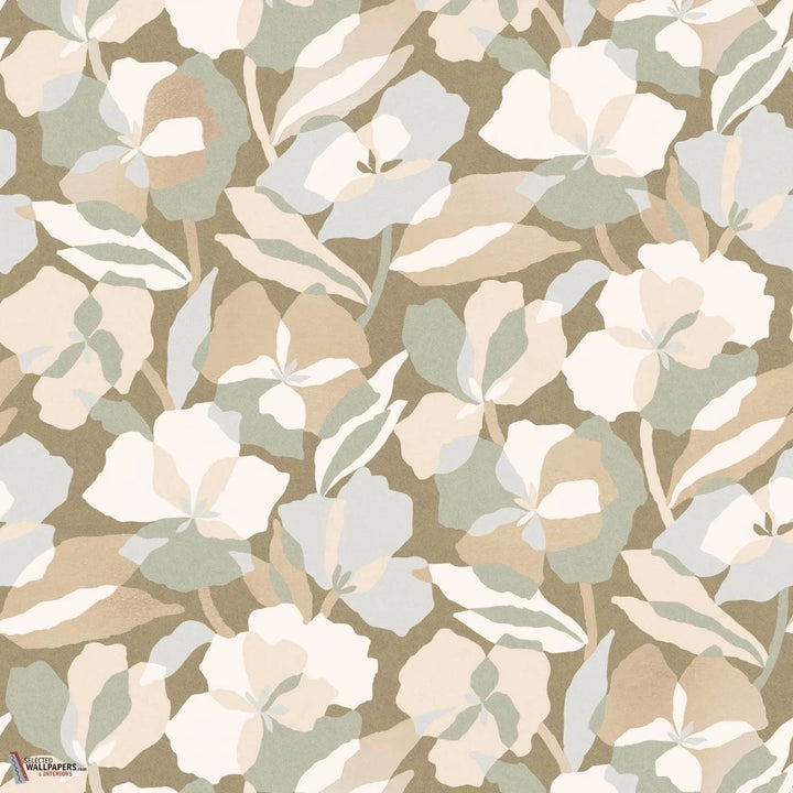 Amaryllis behang Casamance. Dit behang toont bloeiende amaryllis bloemen gestileerd en gedrukt als kleurvlakken op een uitstraling van vloeipapier. Een hedendaagse compositie vol kleur. Behang Amaryllis Casamance Jardin Felicia behangcollectie.