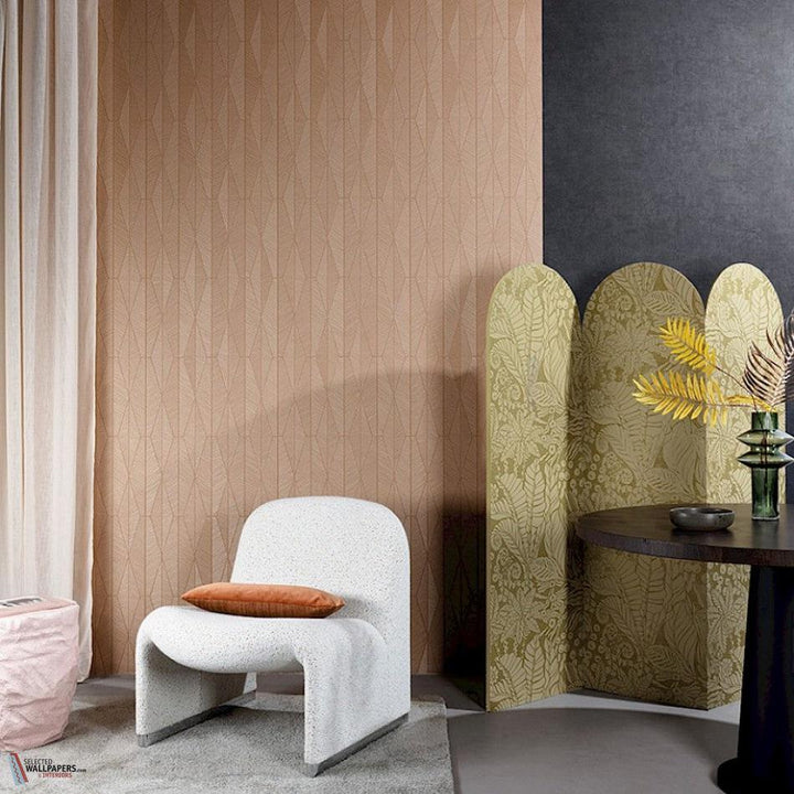 Het bijzondere aan Ari behang is dat de streepjes in twee richtingen zijn geplaatst, waardoor een verrassend lichteffect ontstaat. Hoewel de kleur en het materiaal exact hetzelfde zijn, zorgt de plaatsing ervoor dat het Ari behang er vanuit verschillende hoeken telkens anders uitziet. Dit effect wordt versterkt door een subtiel donkerdere achtergrond, waardoor er extra diepte en contrast ontstaat.