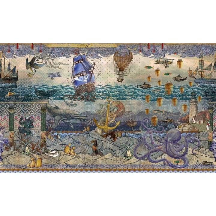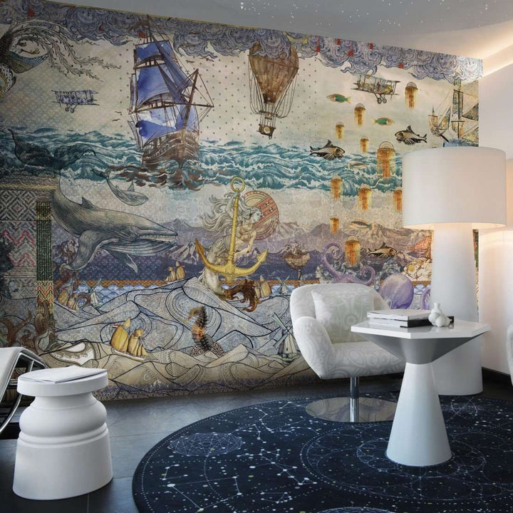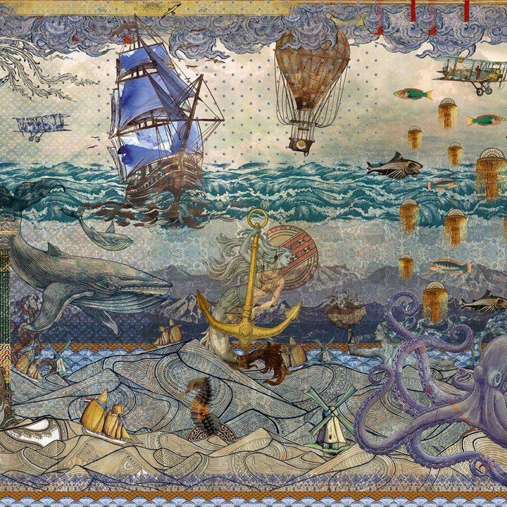 Atlantis behang van LondonArt wallpaper door Marcel Wanders. Dit behang is een oceanisch landschap. Maritieme schilderijen uit de 'Gouden eeuw' met afbeeldingen van Delftse keramische beelden. Schepen op ruwe zee en een kijkje onderwater.