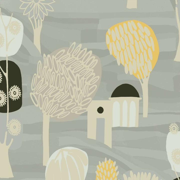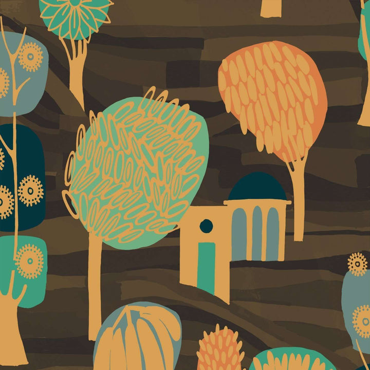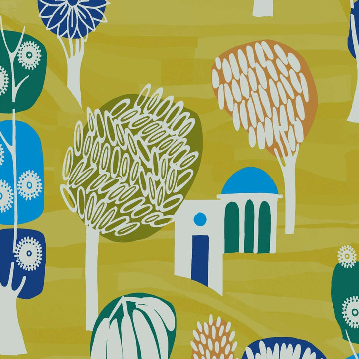 Balade en toscane luxe behang van Elitis. Dit behang heeft een geillustreerd ontwerp met bomen en gebouwen die zich als een speels landschap over de wand verspreiden. Geef je ruimte kleur en sfeer met dit behang.