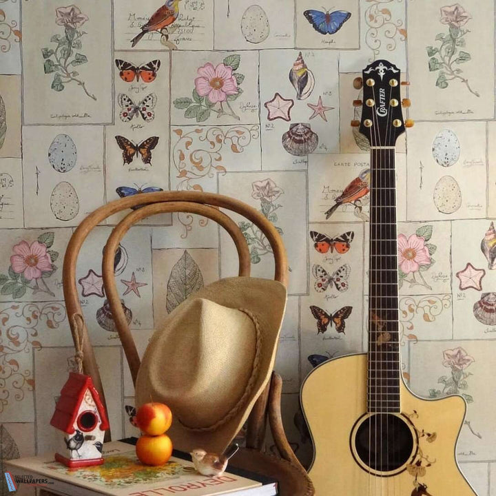 In een mengeling van allegaartjes zijn ansichtkaarten en botanicusplanken met schelpdieren of bladeren met vlinders subtiel verspreid.
