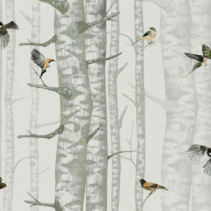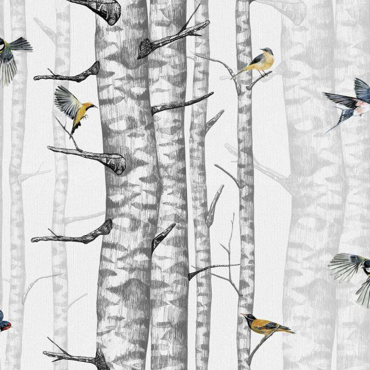 Birch Trees behang van Coordonne. Dit behang heeft een ontwerp met boomstammen die verdwijnen in het plafond. Rondom deze stammen leven bijzonder vogels in hun prachtige kleuren. Een behang verkrijgbaar in meerdere kleurstellingen.