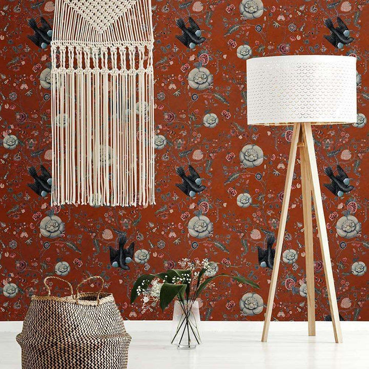 Black Bird behang van Mind the Gap. Dit behang heeft een bohemien sfeerontwerp, vol met bloemmotieven en zwarte vogels op een rode achtergrond.