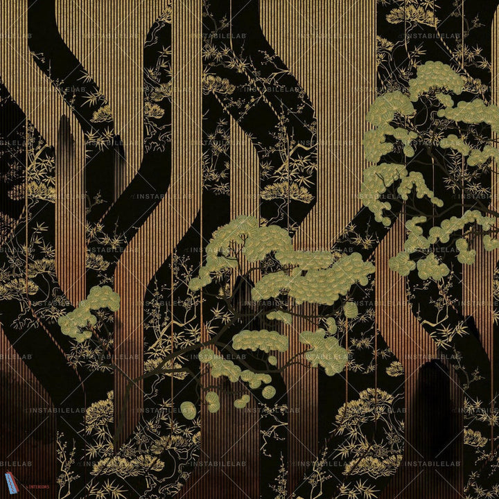 Blair behang van INSTABILELAB. Dit behang toont een oosters ontwerp met bloemen en planten uit Japanse tuincreaties. Speels en vol contrast. Behang Blair Instabilelab 24K behangcollectie.