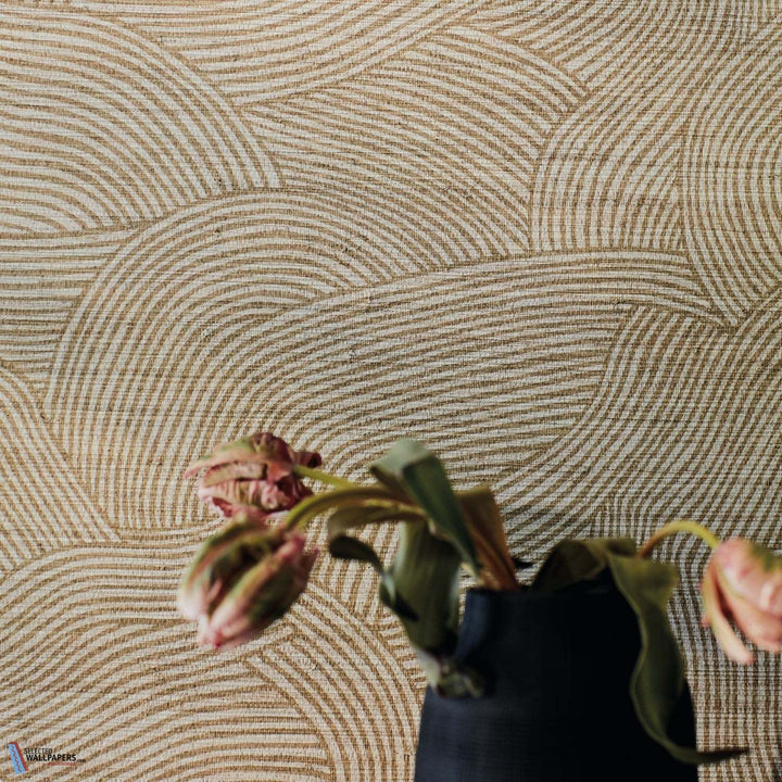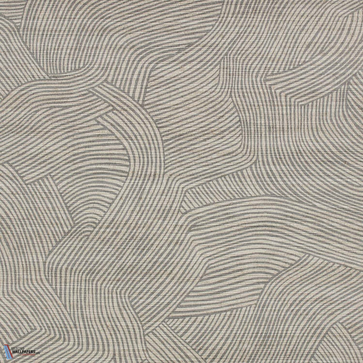 Boa behang Black Edition. Dit behang is een rustig tafereel van in elkaar grijpende golven. Geprint op een geweven raffia. Behang Boa Black Edition Tabala behangcollectie.